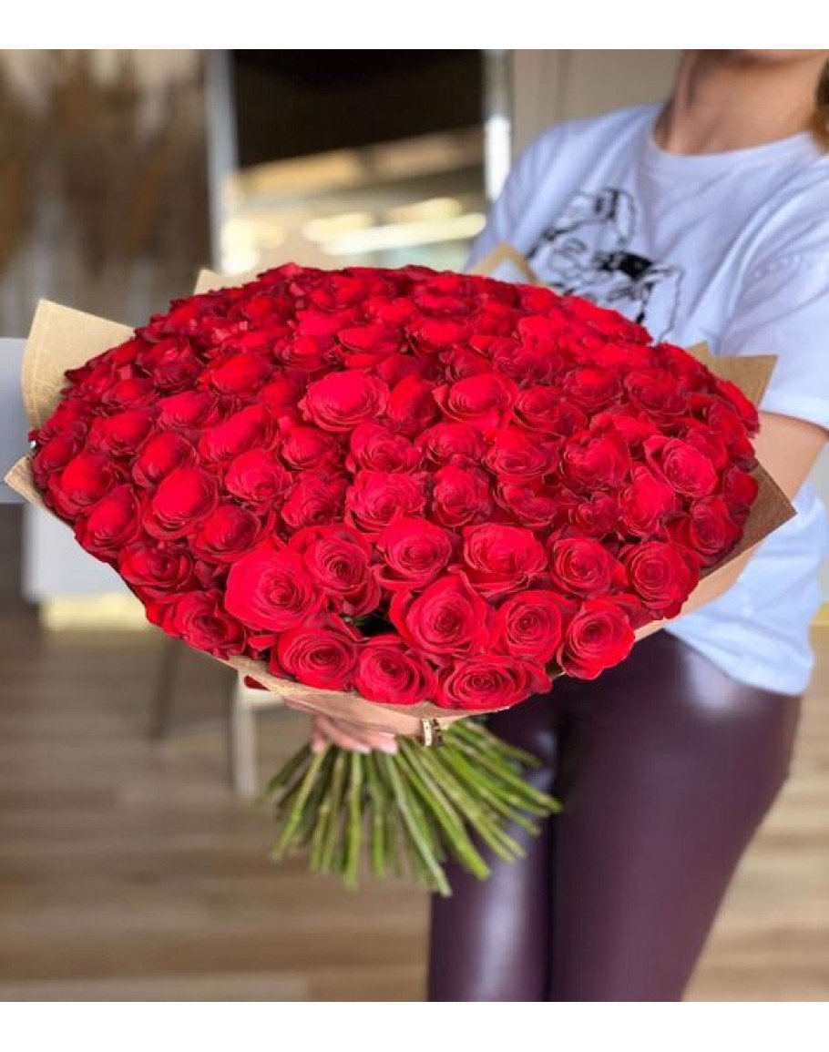 Naturel gazete kağıdı ambalajında hazırlanmış 121 adet kırmızı gül. Yaklaşık ürün yüksekliği 50 cm'dir.