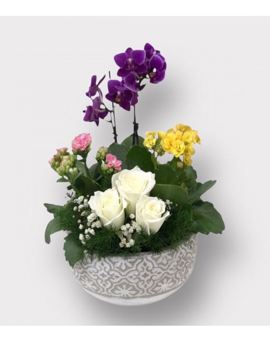 Mini Orkide , kalonşo bitkileri ve beyaz güller Yaklaşık ürün yüksekliği 20 cm dir.