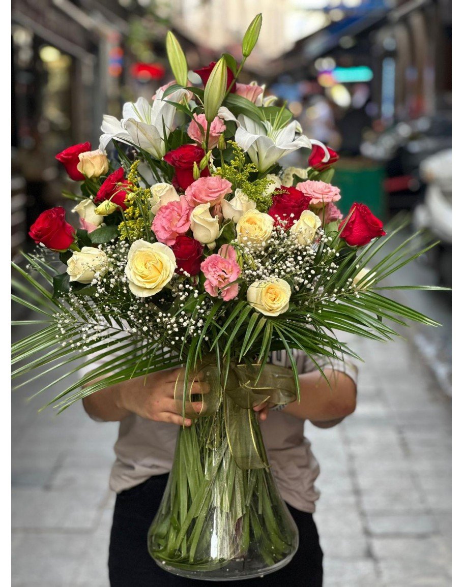 Cam Vazoda Renkli Gül Aranjmanı
