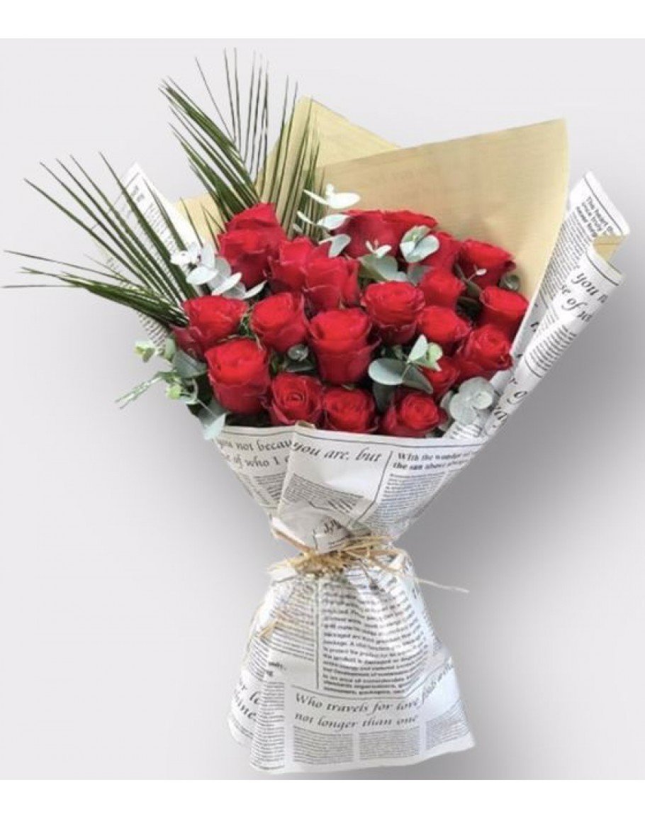 Feniks ve okoliptus yeşillikleriyle tamamlanmış 21 adet kırmızı gül