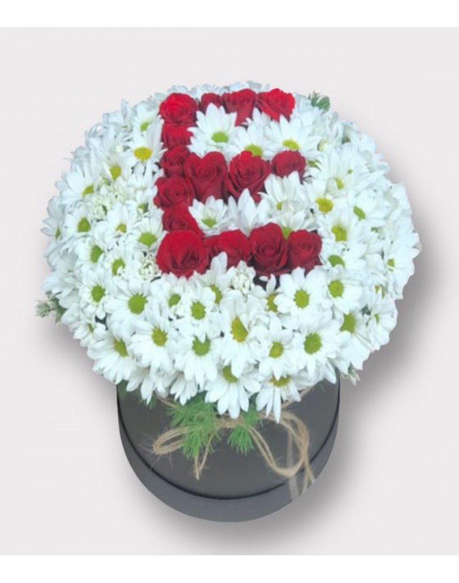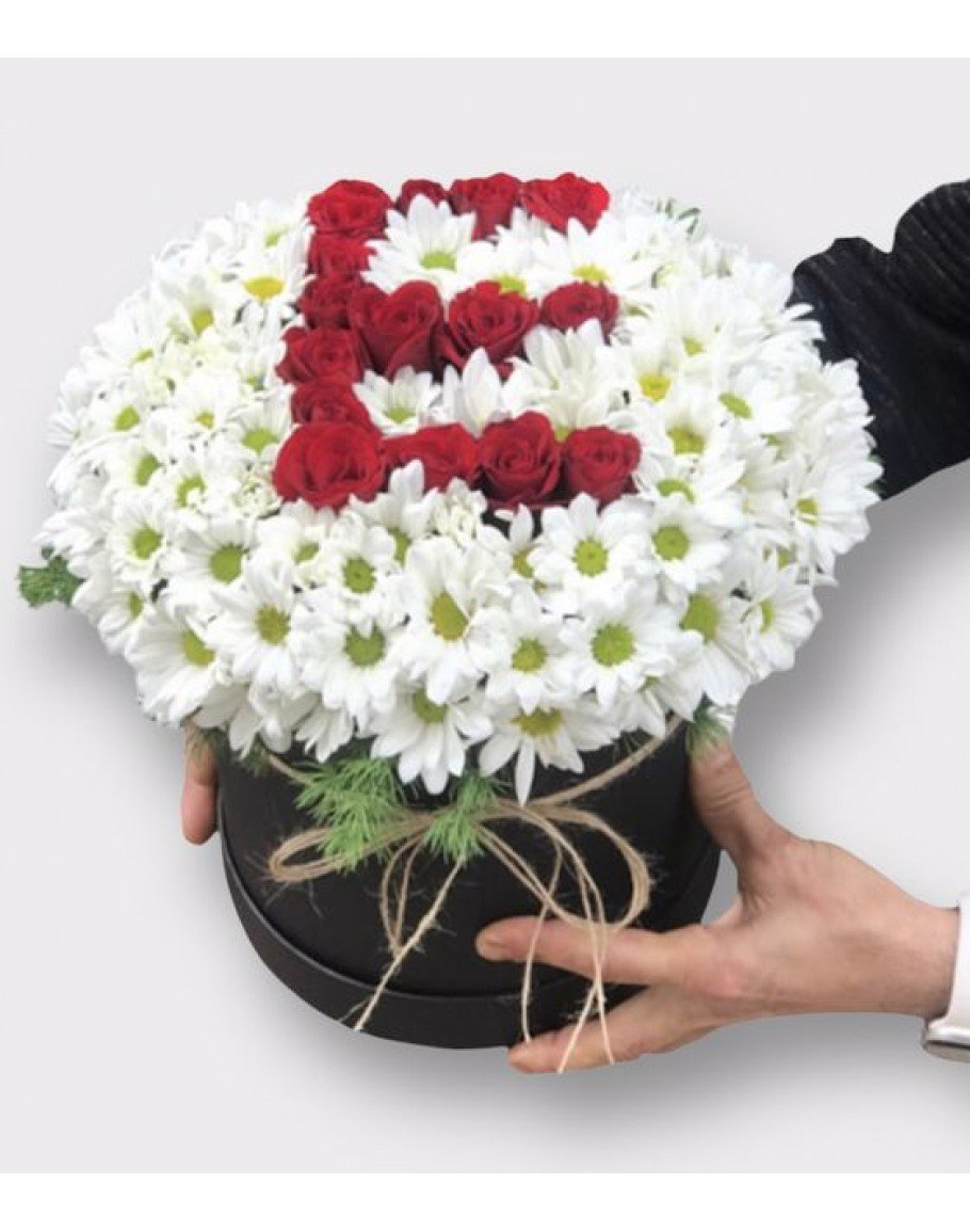 Yuvarlak siyah kutuda beyaz papatya ve kırmızı güller ile kişiye özel istediğiniz baş harf ile hazırlanan kutuda harfli gül tasarımı